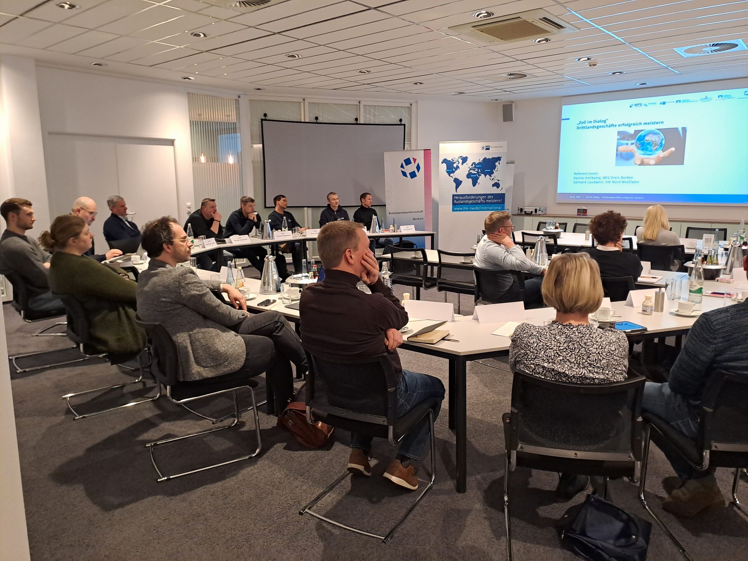 Rund 25 Vertreterinnen und Vertreter kleiner und mittlerer Unternehmen kamen in den Räumlichkeiten der Volksbank Bocholt zusammen, um sich über aktuelle Entwicklungen im Exportgeschäft mit Nicht-EU-Staaten zu informieren und konkrete Fragestellungen aus ihrem Arbeitsalltag zu diskutieren. Die Veranstaltung knüpfte an den Erfolg des ersten Workshops in Bocholt an und setzte erneut auf einen intensiven, praxisorientierten Austausch.